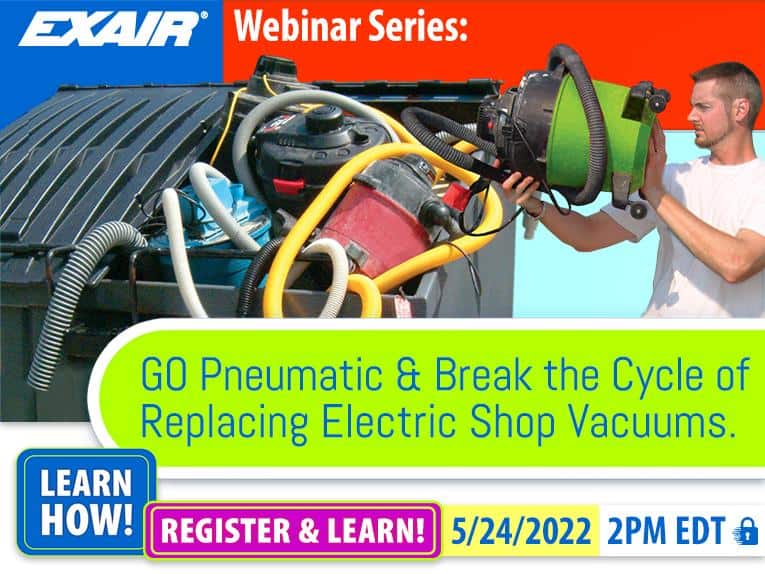 Webinar EXAIR: ¡Rompa el ciclo de sustitución de los aspiradores eléctricos! Infórmese sobre los Sistemas de Aspiración Industrial Neumáticos.