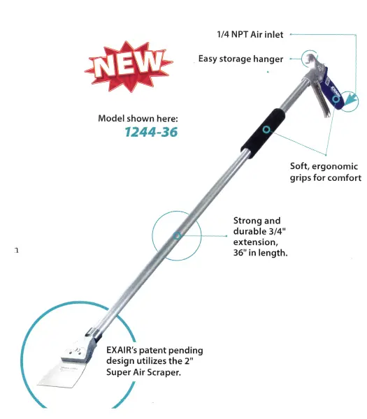 La Espátula Neumática se utiliza en combinación con la Boquilla Plana de Soplado de 2” EXAIR e instalada en la Pistola de Soplado de Mango Suave, proporcionando potencia, durabilidad, resistencia a la corrosión y comodidad.