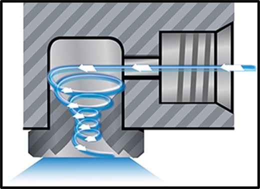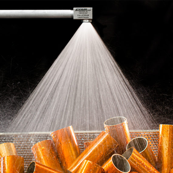Las Boquillas de Aspersión FullStream™ EXAIR no requieren de aire para operar. Producen gotas por la aceleración del fluido rompiendo su tensión superficial a través de un orificio preciso o impactando contra la superficie de la boquilla. Comparado con las Boquillas Atomizadoras EXAIR, las boquillas de aspersión generan mayor volumen del fluido y producen un patrón grueso de aspersión en forma de Cono Lleno. El mayor rango de caudal es beneficioso para algunas aplicaciones industriales más comunes cómo limpieza, enfriamiento, enjuague, supresión de polvo o lavado. Muchas boquillas de aspersión operan correctamente cuándo el liquido utilizado contiene particulado o es viscoso.