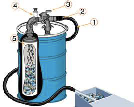La manguera de aspiración se conecta al Chip Trapper (2). La válvula de control direccional de flujo (3) y la manija en la bomba (4) se ubican en la posición de “llenado”. La válvula de suministro de aire comprimido (entre 5,5 y 7 bar) es abierta para permitir que el aire fluya a través de la bomba, empujando el líquido refrigerante a lo largo de la manguera para pasar por el filtro bolsa (5) hacia el tambor. Cuando todo el líquido está en el tambor, se cierra la alimentación de aire. El líquido filtrado puede entonces ser filtrado nuevamente hacia el tanque de refrigeración para su reutilización, con la válvula superior en la posición de “vaciado”. Todos los contaminantes sólidos permanecerán en el filtro.
