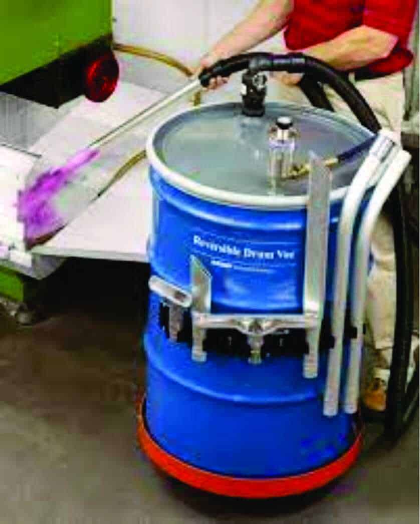 El Sistema para Aspiración de Líquidos de EXAIR, Reversible Drum Vac, funciona con Aire Comprimido y puede ser fácilmente conectado a cualquier tambor estándar de 110, 205 o 410 litros en menos de 85 segundos.