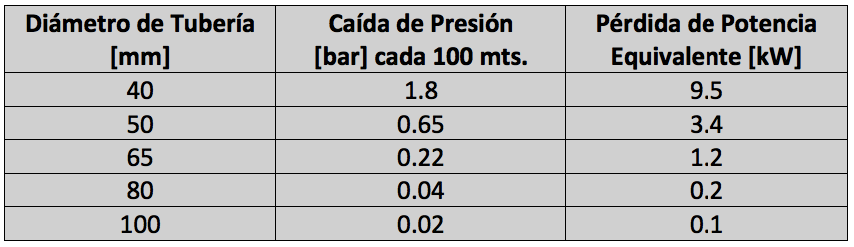 • La caída de presión no debe ser mayor del 10% entre la Sala de Generación y el punto de consumo más alejado, por lo que se recomienda mantenerla entre 0.3 y 0.5 bar como máximo.