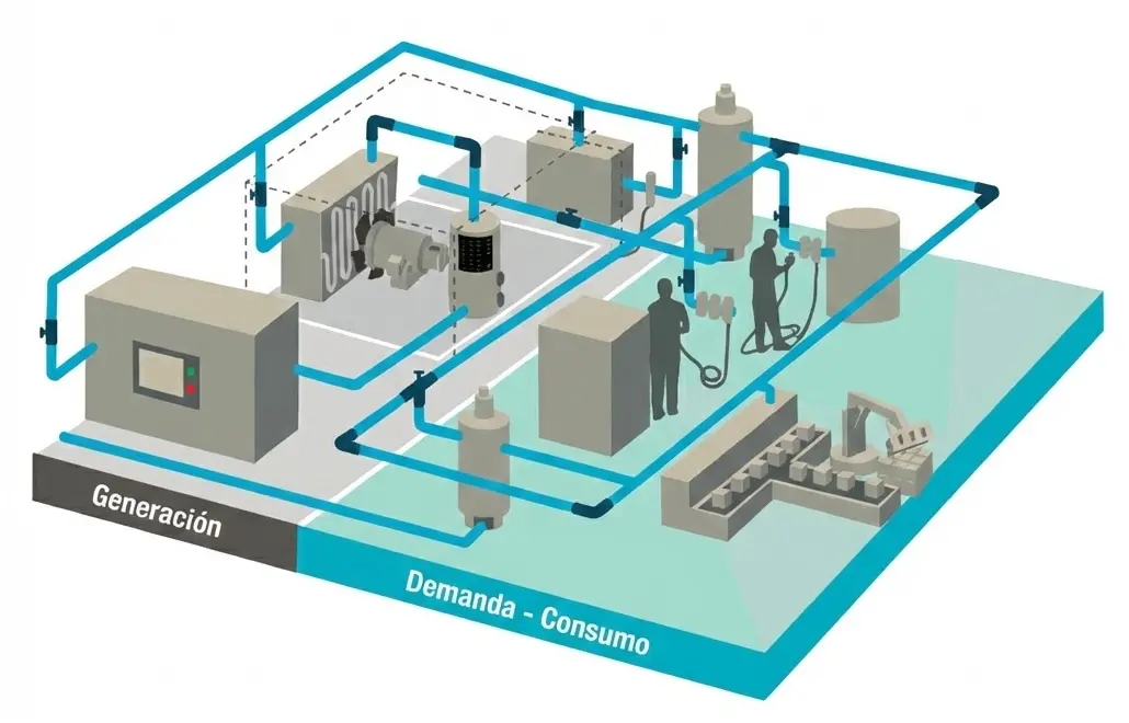 La mayoría de las instalaciones de Aire Comprimido utiliza un volumen de Energía considerablemente mayor de la necesaria para sostener la Demanda, la cual no sólo se compone de las Aplicaciones, sino también de las Fugas y usos irracionales.